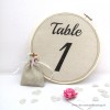 Le tambour à broder numéro de table sera une excellente idée pour une décoration mariage vintage. Faites broder ou imprimer une toile avec le chiffre ou le nom de la table que vous souhaitez donner. Vous pourrez alors placer votre cercle à broder sur un chevalet ou le poser simplement contre un vase ou une bouteille. Choisissez plutôt un tissu à la maille serrée comme le coton ou le lin pour l'impression sur tissu.