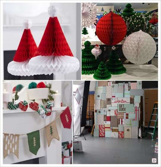 Des paquets cadeaux factices sont un classique des vitrines de noel. Vous pourrez certes les empiler, mais pourquoi pas carrément fabriquer un mur de cadeaux. Les décorations en papier seront également une façon de décorer votre vitrine à peu de frais. A l'exemple de ces bonnets de père noel ou encore de ces sapin en papier alvéolé, vous pourrez disposer ça et là ces décos en papier. Des guirlandes de fanions en toile de jute ou des guirlandes de chaînes de papier se fondront également dans un décor de Noel.