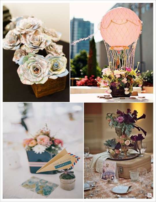 Vous pourrez confectionner une montgolfière en utilisant un ballon gonflé à l'hélium et un panier. Si vous aimez les roses, vous pourrez réaliser des roses en papier. L'originalité sera d'utiliser des cartes géographiques pour confectionner des fleurs.