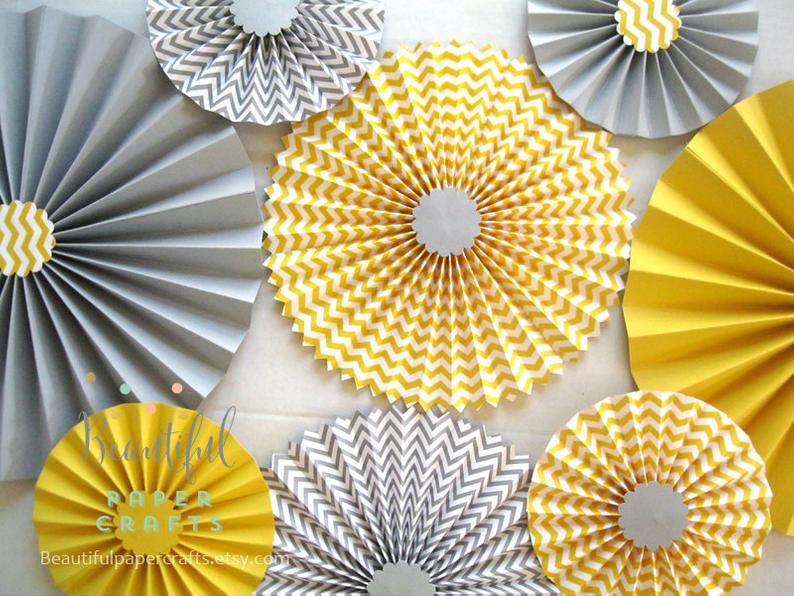 Rien de tel pour décorer un mur que des cocardes en papier. Vous pourrez jouer avec des papiers unis ou à motifs en gris et jaune pour illustrer les couleurs de l'année 2021. Utilisez de l'adhésif double face pour fixer vos cocardes au mur.