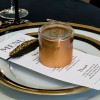 Choisissez une police d'écriture à l'esprit rétro qui donnera à votre carterie un côté vintage. Pour le côté charleston, misez sur les paillettes et les dorures, comme ce marque place avec liseré doré. Vous pourrez également choisir un marque place sous forme de plume doré.