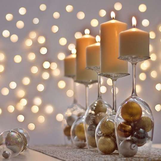 Pour agrémenter le centre de table, vous pourrez recourir à des vases imitant la forme de verre à pied comme des vases martini ou vase cognac. Garnissez-les de boules de noel pour l’occasion. Vous pourrez utiliser des boules lucioles lumineuses pour créer l’impression de bulles et cela apportera une touche scintillante à la décoration. Elles pourront être immergées dans le vase. Vous pourrez également y disposer des colliers de perles.